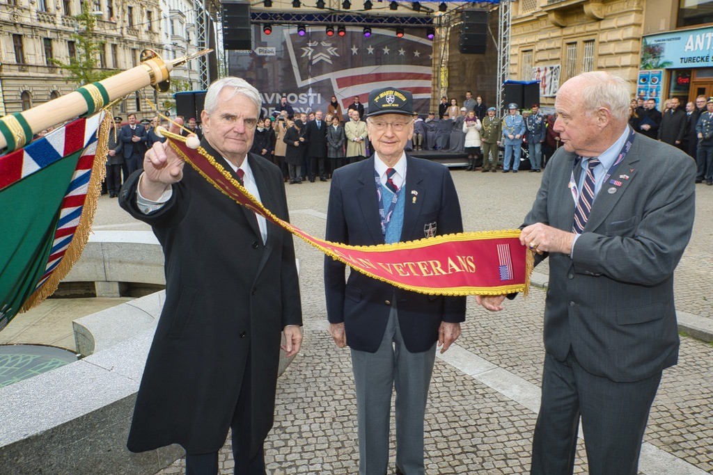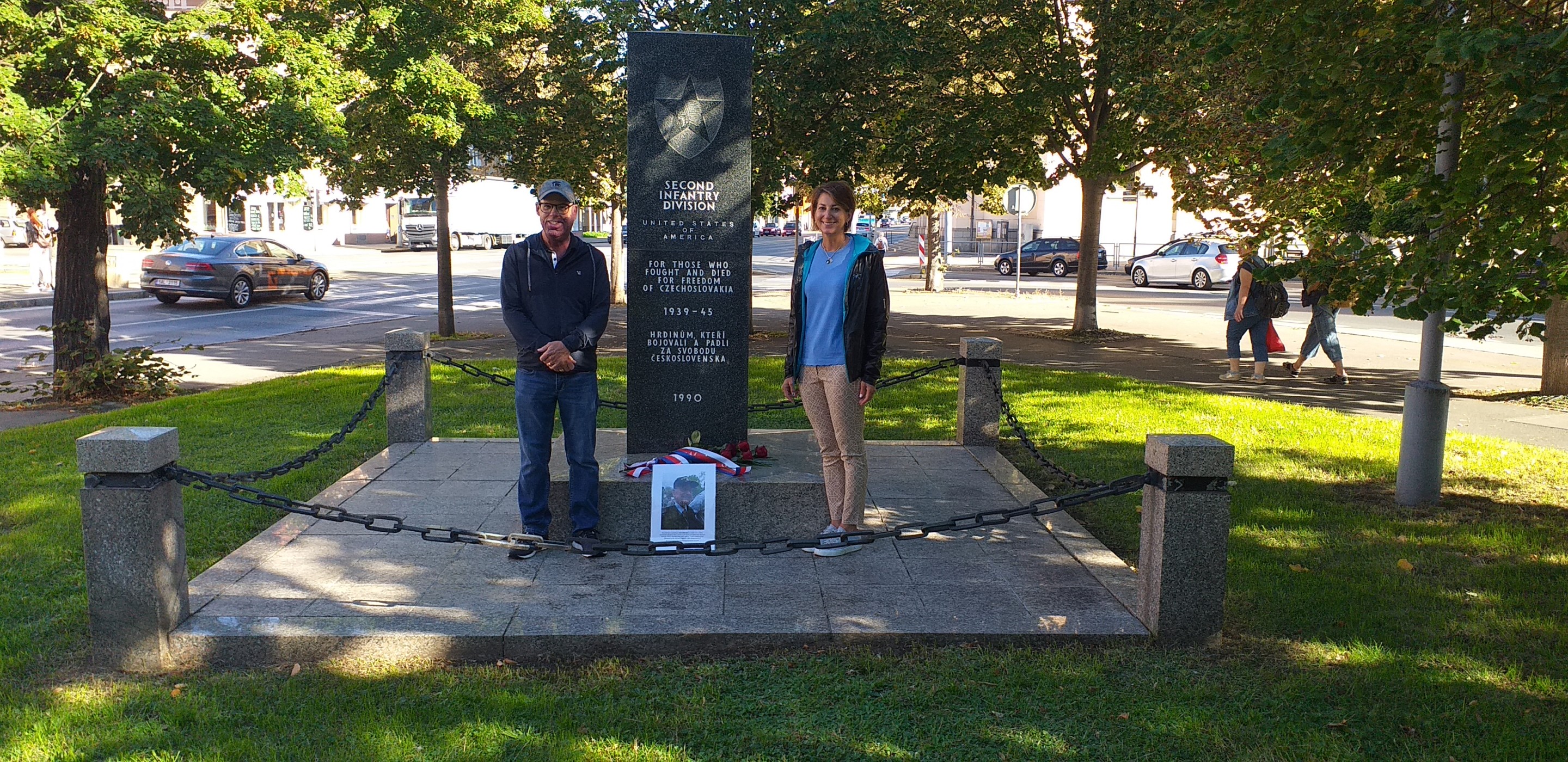 Tým Slavností svobody, Patton Memorial Pilsen, Tom a Leslie Duncanovi dnes na počest PANA plukovníka společně položili růže u pomníku 2. pěší divize na Chodském náměstí.