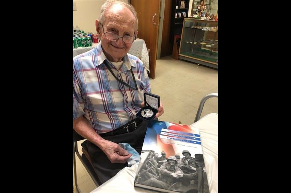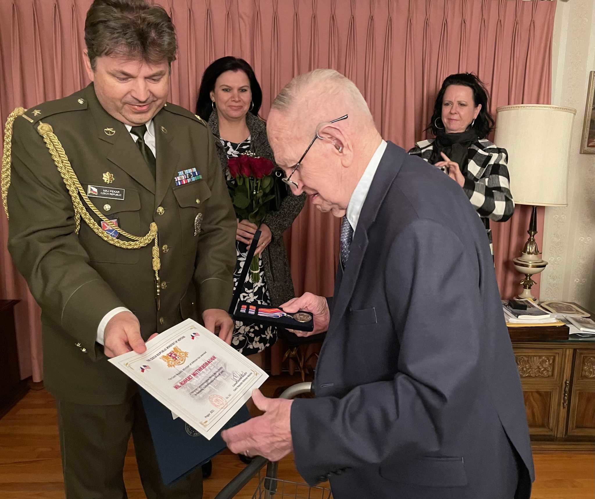 At the end of the war, Robert Muthersbaugh was 23 years old. A radio operator of the Headquarters Company of the 16th Armored Division, he was in one of the first military vehicles to enter Pilsen as part of General George Patton’s Third Army. He received the Bronze Star Medal which is the fourth-highest ranking award for heroic and meritorious deeds.