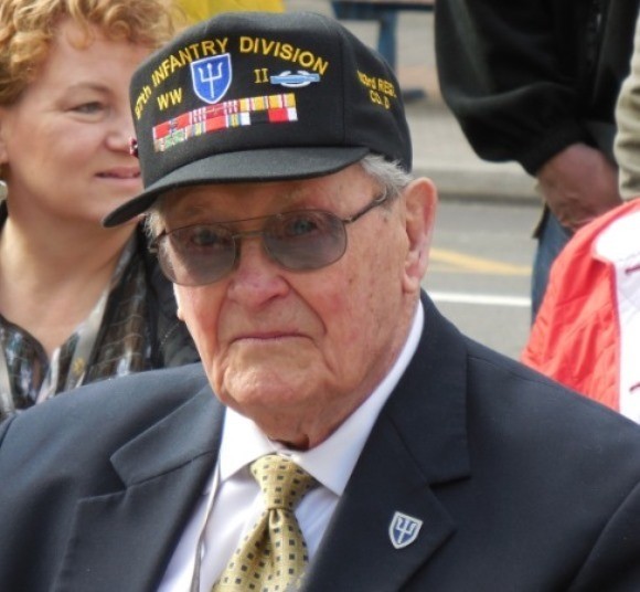 After he passed the test for the Army Air Corps he received flight training in Iowa and when was scheduled to go to Santa Ana, California for pre flight the order came that all former ground force members had to go back for the big push in Europe. Rob Crooker went back to the infantry and joined the 97th Infantry Division in Fort Leonard Wood, Missouri. He arrived in the European theater (ETO) just after the Battle of the Bulge. He landed by ship in the port of Le Havre, France. Then he moved to Aachen, Germany and fought his way through Germany as a part of Company D, Dog Company, a heavy weapons company equipped with 81-mm mortars and .30- and .50-caliber machine guns. Rob was in a mortar squad that was attached to A, B and C Companies of the 303rd Infantry Regiment, and they were right behind them. They eventually became part of Patton’s Third Army. Near the end of the war, his regiment liberated a German concentration camp, filled with Jewish people from around Europe, and numerous villages in what is now the Czech Republic.